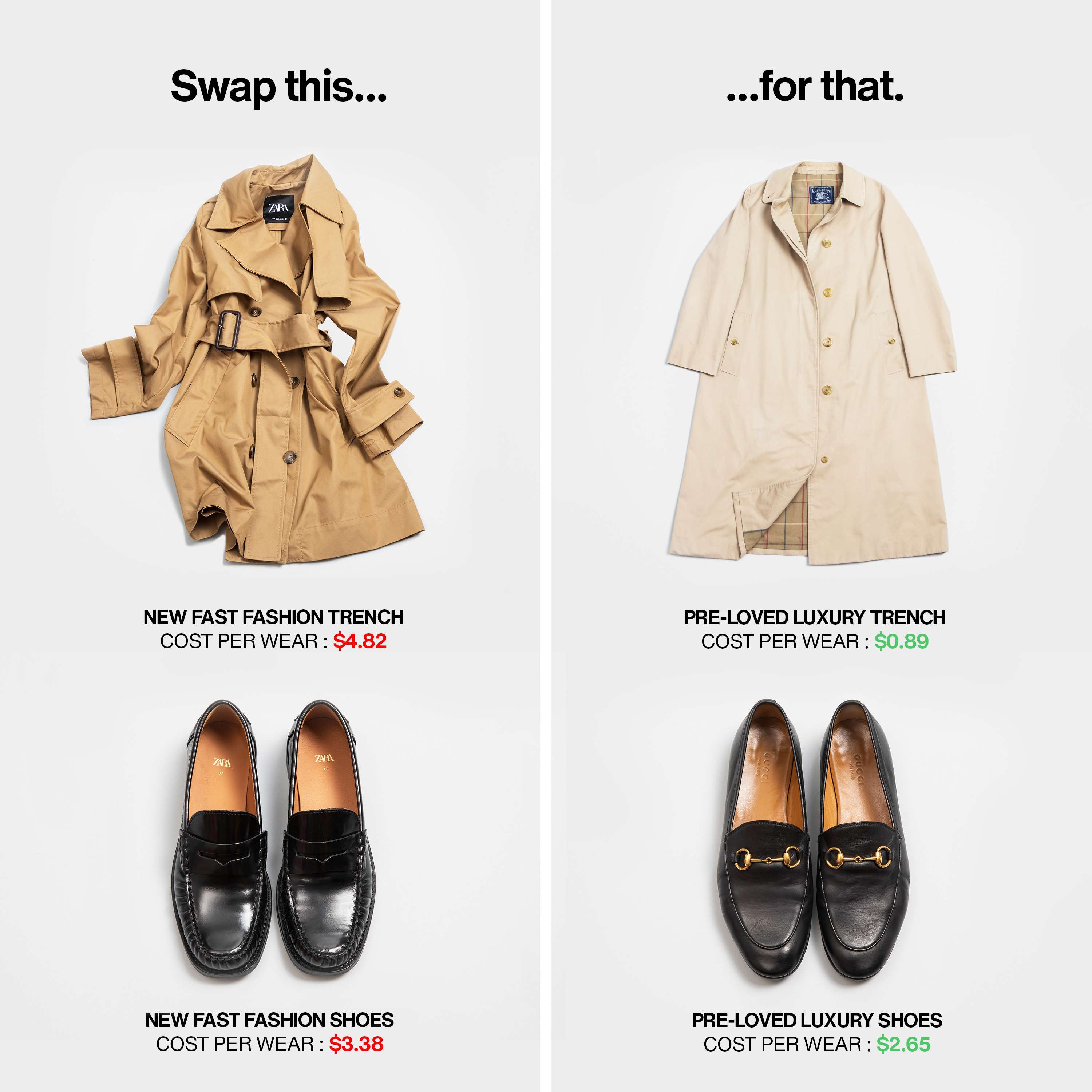 Their consumer survey demonstrated that due to several factors (number of wears, resale value, etc.), brand new fast fashion items ultimately have a 33% higher cost-per-wear than the luxury pre-loved items available on Vestiaire Collective.