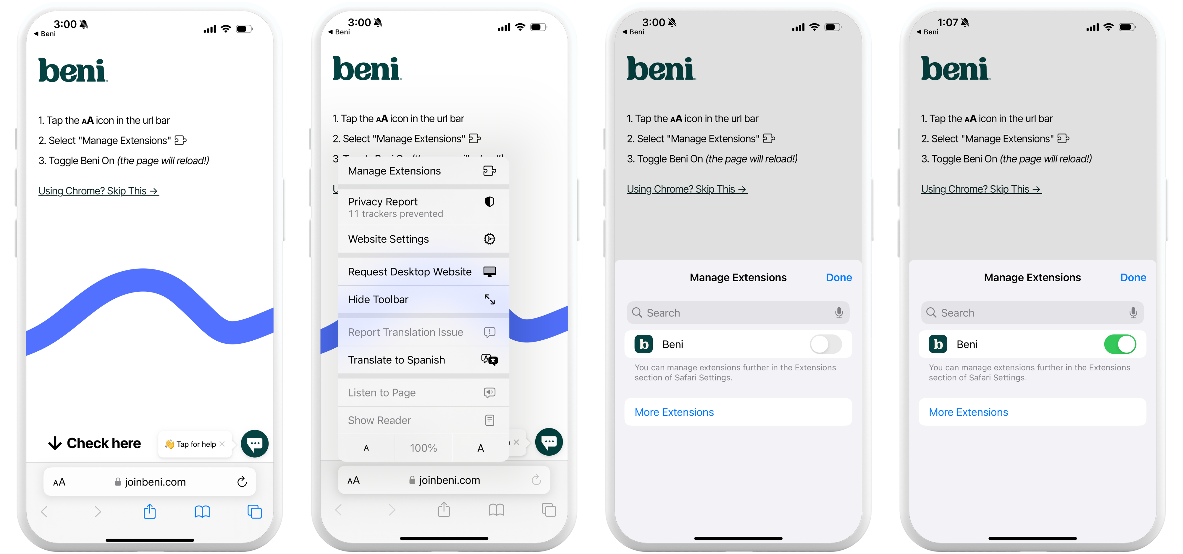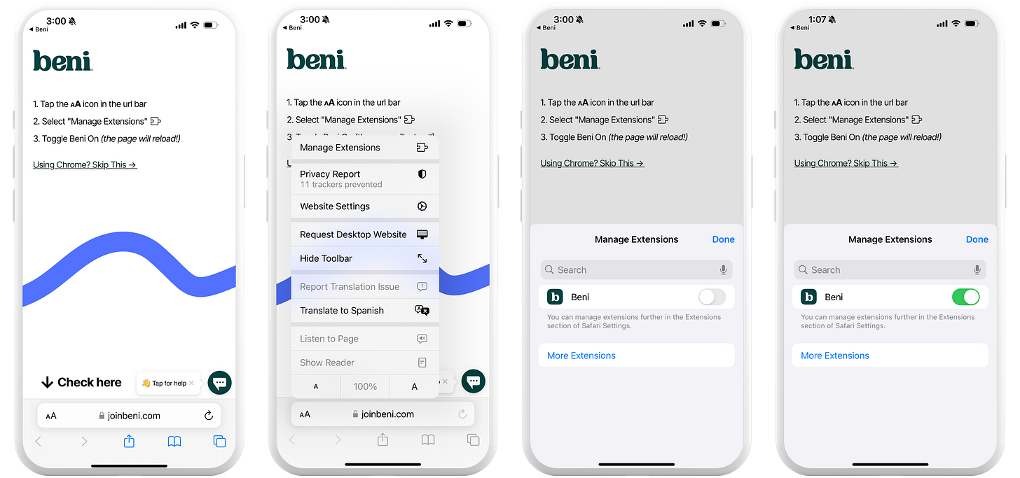 As far as Beni is concerned, the simplest solution is to stick to the Beni Chrome desktop extension because it requires wayyyy less steps to set up. But, if you want to see the best resale deals while you shop on your phone, here’s how to set up and use the Beni mobile extension. If you’re still having trouble setting up the mobile extension, sign up for a first-time user interview with a member of our team, so we can get you up and shopping resale in no time!
