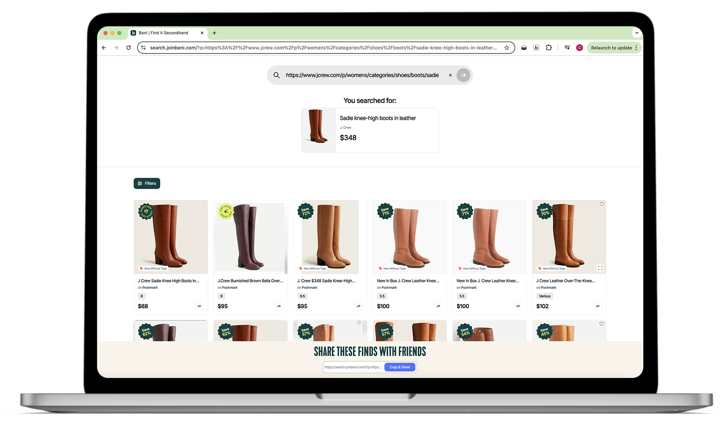 The Beni Chrome extension is your secondhand shopping sidekick. Instead of having a specific product in mind, you can browse as normal and Beni will point out if a cheaper resale alternative exists.