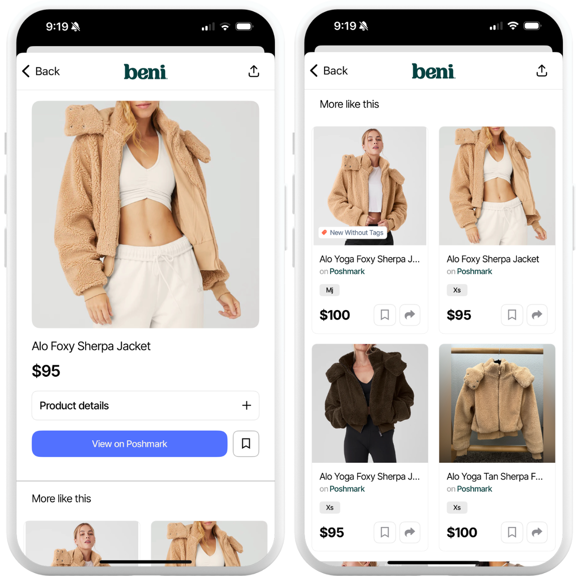 Search anything secondhand with the Beni app or checkbeni.com (like this Alo Yoga jacket).