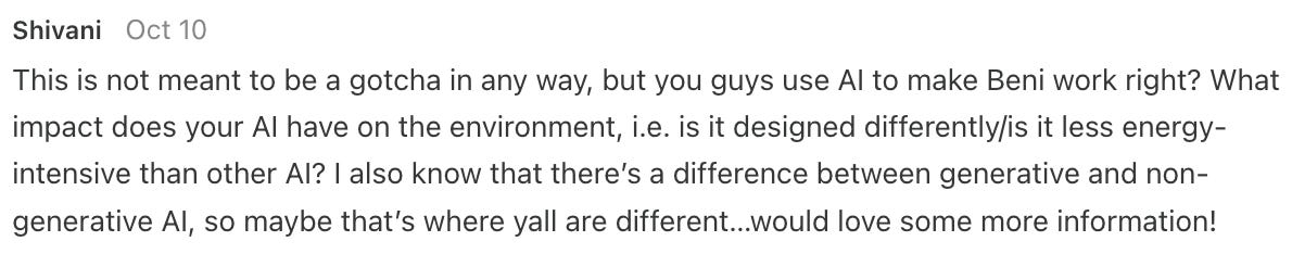 Smarter AI, Lower Energy Use: We understand that AI can sometimes raise concerns about computing costs, but not all AI is the same! Generative AI, which creates new content (like text or images), can be energy-intensive because it requires a lot of processing power. Beni’s AI, on the other hand, focuses on searching for existing items and finding secondhand options efficiently. This approach uses less energy because it doesn’t involve generating new content, just connecting you to the best secondhand options out there. Plus, we made updates earlier this year to optimize our system even further, ensuring it runs smoothly and efficiently as we grow.