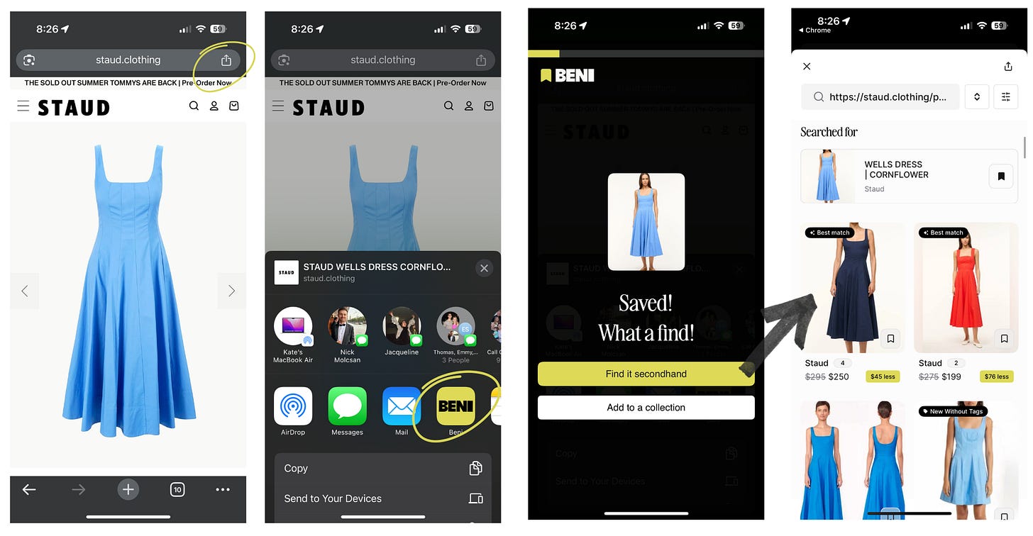 To help, we make it easy to store all your inspiration into Beni so instead of impulse buying you can get the dopamine hit by adding it to your Beni storefront, knowing you can revisit later. When you’re ready to buy — Beni will show you the item you saved along with secondhand listings so you can make the best choice.