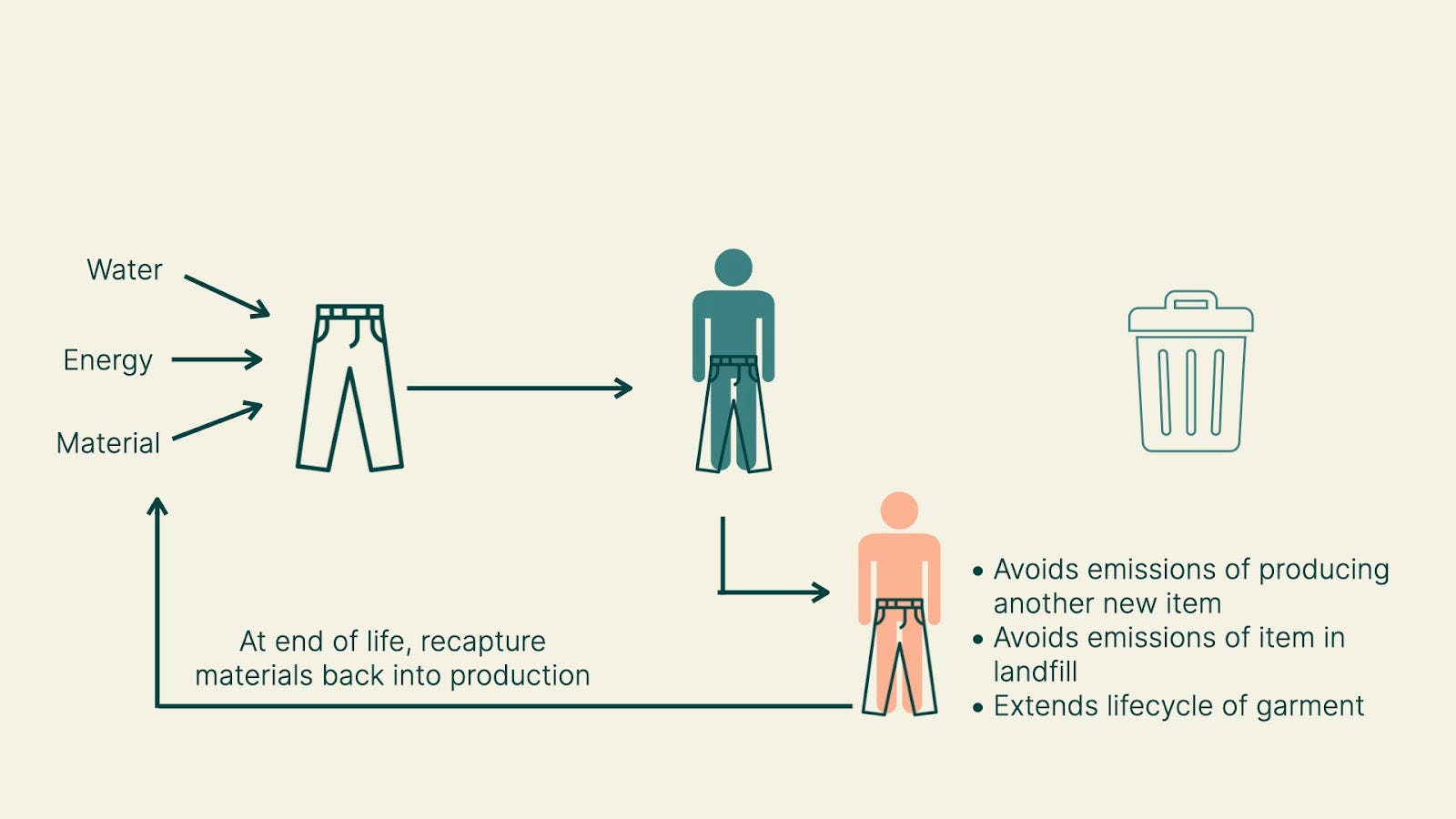 In this blog post we talked about how, in general, increasing the amount of items we procure through circular models is better for the planet because (a) it would keep more garments in use for longer, better leveraging the energy used to produce the garments, and (b) it would displace the need to purchase (and produce) more net new items. This means that, ideally, switching from a linear production and consumption model to a circular one would look something like this: