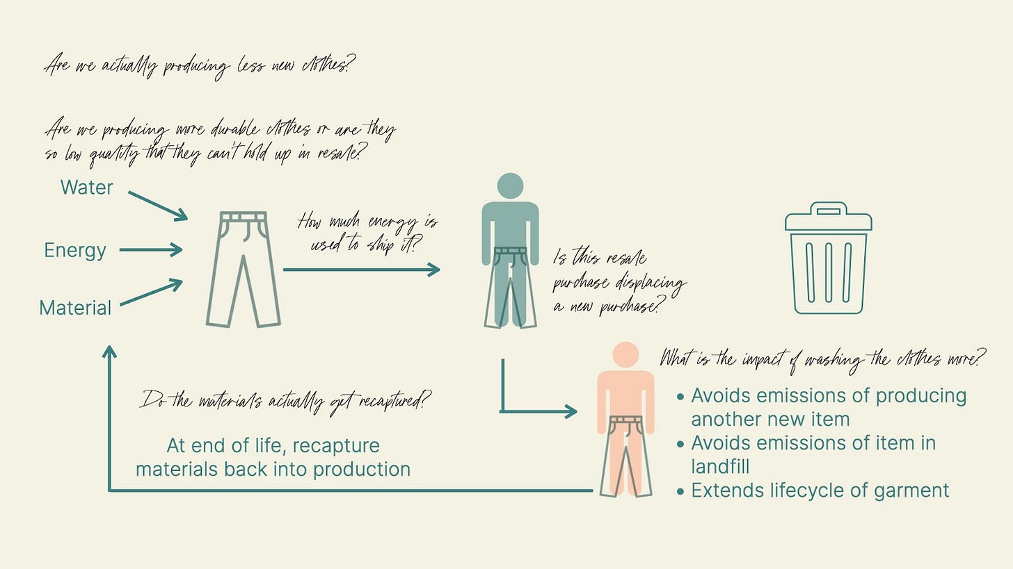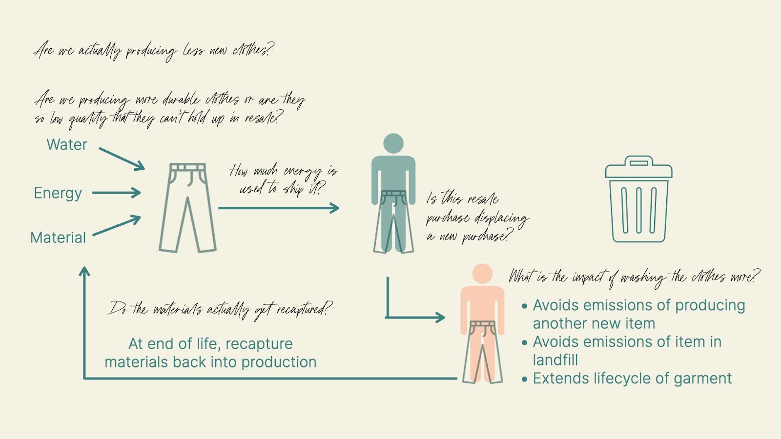 At first glance, this picture can seem discouraging. If it’s so unclear whether resale has a positive impact on the planet, then why are we focused on it? Well, research to date has taken these nuances into account (as much as possible) and has shown that resale still has a net positive impact on the planet! Specifically, a recent analysis shows that buying and wearing secondhand clothing instead of new reduces carbon emissions by an average of 25%. We dive into this research in this recent blog post. If you want to really get into the details, I recommend reading the report, particularly looking at p. 52 for scenarios based on different assumptions related to some of the questions listed above.