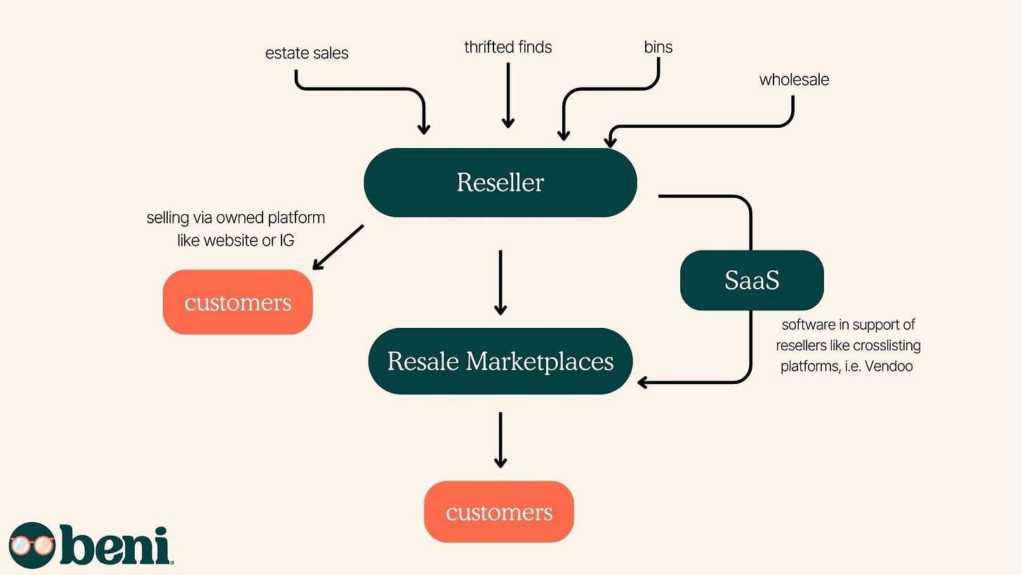Resellers occupy an interesting place in the secondhand industry because they are both customers and providers within it. They buy from many of the other players in the industry like thrift stores or wholesalers. They makeup a decent portion of the usership of peer-to-peer marketplaces. Plus, the reseller's ability to leverage social media and generate excitement for secondhand goods has driven new brands to get involved and invited new types of businesses to enter the secondhand industry as business-to-business service providers. Software as a Service (SaaS) businesses such as cross listing platforms like Vendoo and List Perfectly arose to help resellers scale across multiple marketplaces. Resale as a Service (RaaS) businesses exist as a response to the desire to tap into the resale market. While the reseller isn't single-handedly responsible for this industry expansion, they certainly played an important role in offering market validation and excitement for more secondhand possibilities.