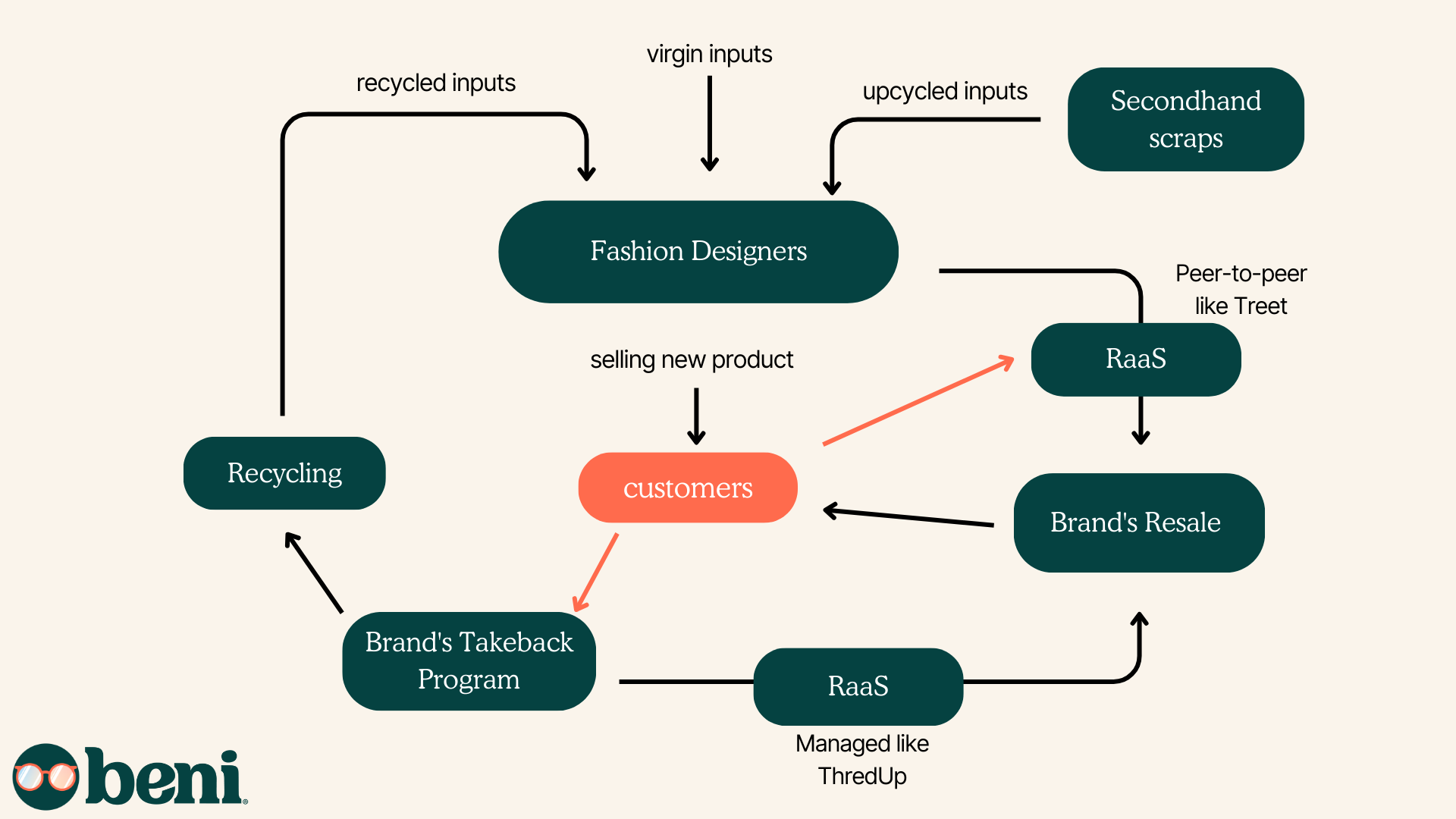Even if brands don't plan on taking advantage of resale models, designers are making decisions that impact the future flow of clothing. Given the popularity of synthetics in the last few decades, the demand for recycling infrastructure to manage those textiles is prevalent. Without any recycling or resale to divert them, those clothes will sit in landfill for centuries. Designers can also choose to use diverted textiles as an input. Designers may incorporate recycled textiles into their designs (better still if they are creating a take-back program with recycling partners that allow them to capture and reuse their own customer's waste) or they may choose to use existing secondhand materials to upcycle into something new. With the recent influx of reuse business models, designers can partner alongside these companies to minimize and design waste out of the system.