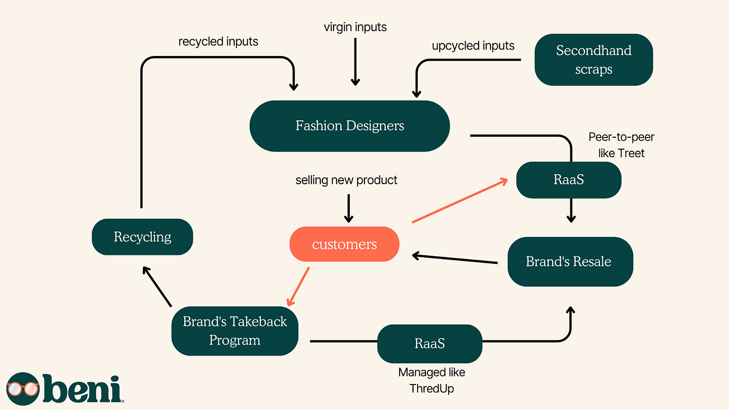 At each step of the clothing production and design process, there are detailed decisions to be made that have a big impact on what the future of that garment may be. For example, combining polyester and cotton into a fabric blend will make that garment harder to recycle in the future given our current tech (even mixing different materials in the threads and tags or adding metal components can make recycling harder— every detail matters). Certain materials or treatments may lend to poorer durability which inhibits a garment's ability to be appealing in secondhand setting. Those choices may be cheaper or desirable in the short-term but they'll compromise the sustainable quality of the garment and the brand's (or any industry player's) ability to capture value on the backend. To be circular and create responsibly, the clothing designer must design with the garment's “end-of-life” or next life in mind. The focus shouldn't only be on recycled materials but also making materials that are recyclable and reusable.