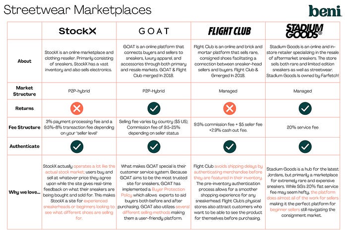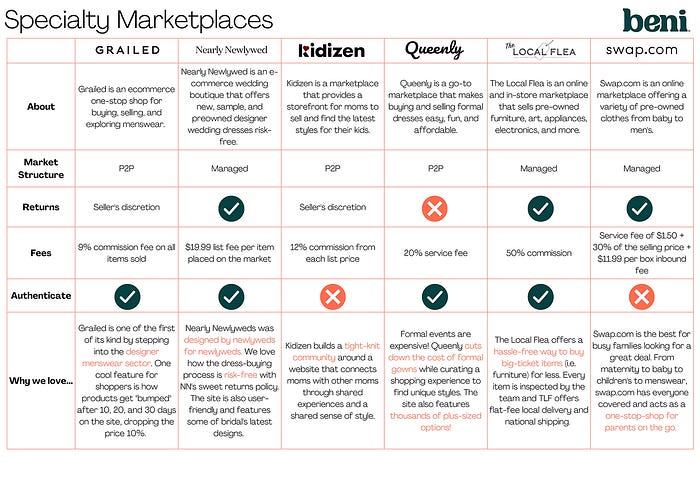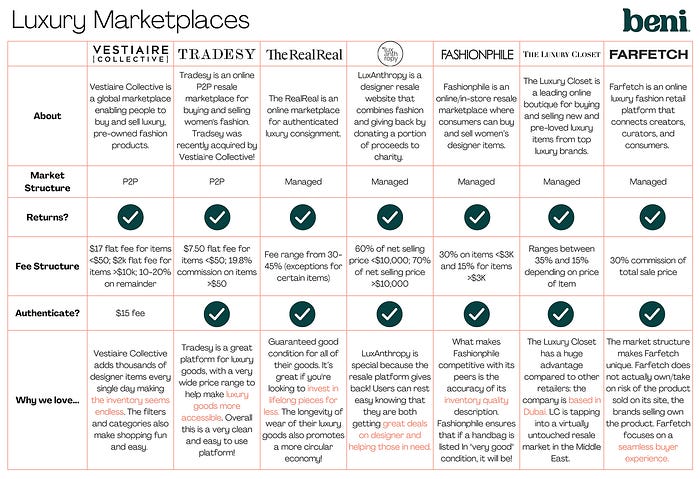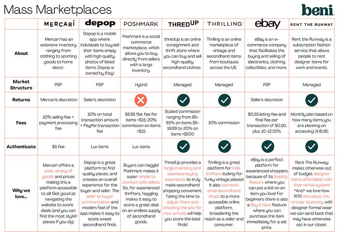 From Beni pro-tips to return policies to fee structures, our cheat sheet demystifies the online secondhand shopping experience so you can spend less time reading the fine print and more time finding the perfect item. We hope this resource helps you find the marketplace that is the best fit for you.