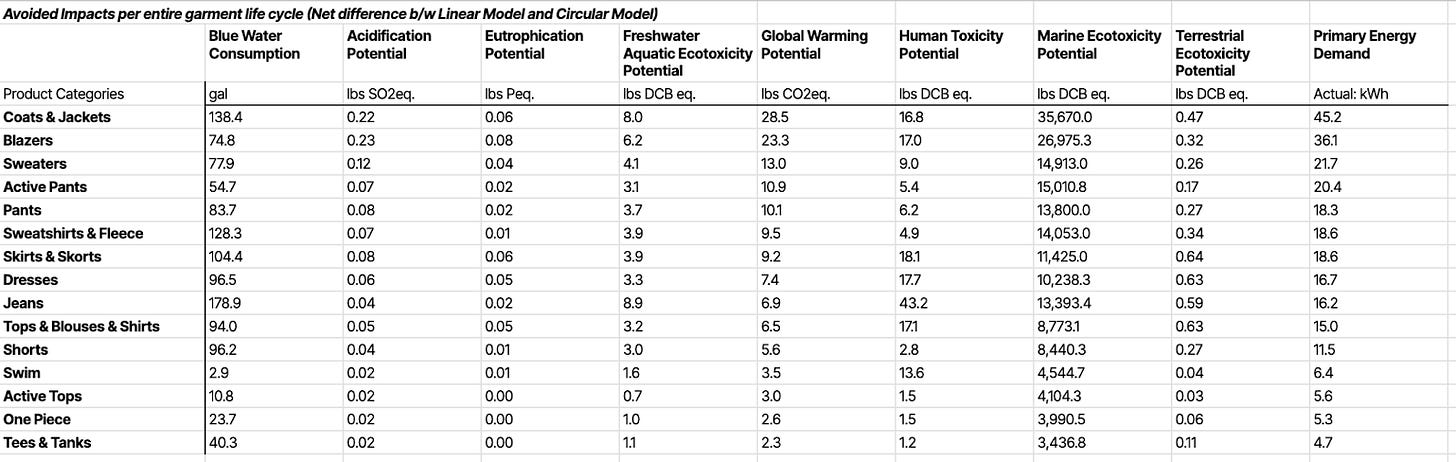 This said, today we only calculate the impact of shifting purchases from new to resale. To calculate this impact, we currently leverage existing research conducted by Green Story & thredUP which uses a life cycle assessment (LCA) methodology. This LCA compares the impact of buying used clothing versus buying an equivalent item new. If you want to learn more about the nuances of the LCA assessment (and the impact of resale in general), check out this blog post.